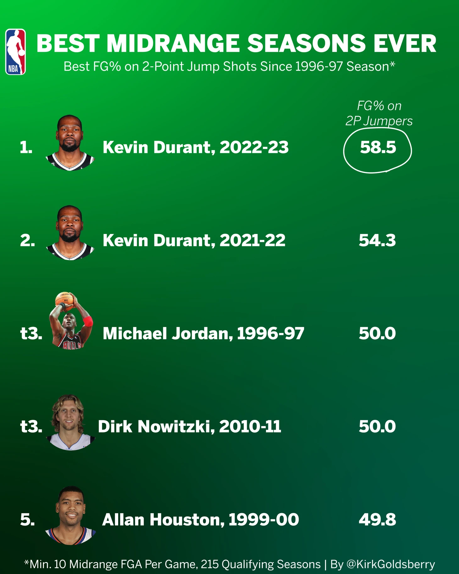 В исследовании аналитика Кирка Голдсберри участвовали только игроки, совершавшие в сезоне не менее 10 бросков со средней дистанции в среднем за матч.