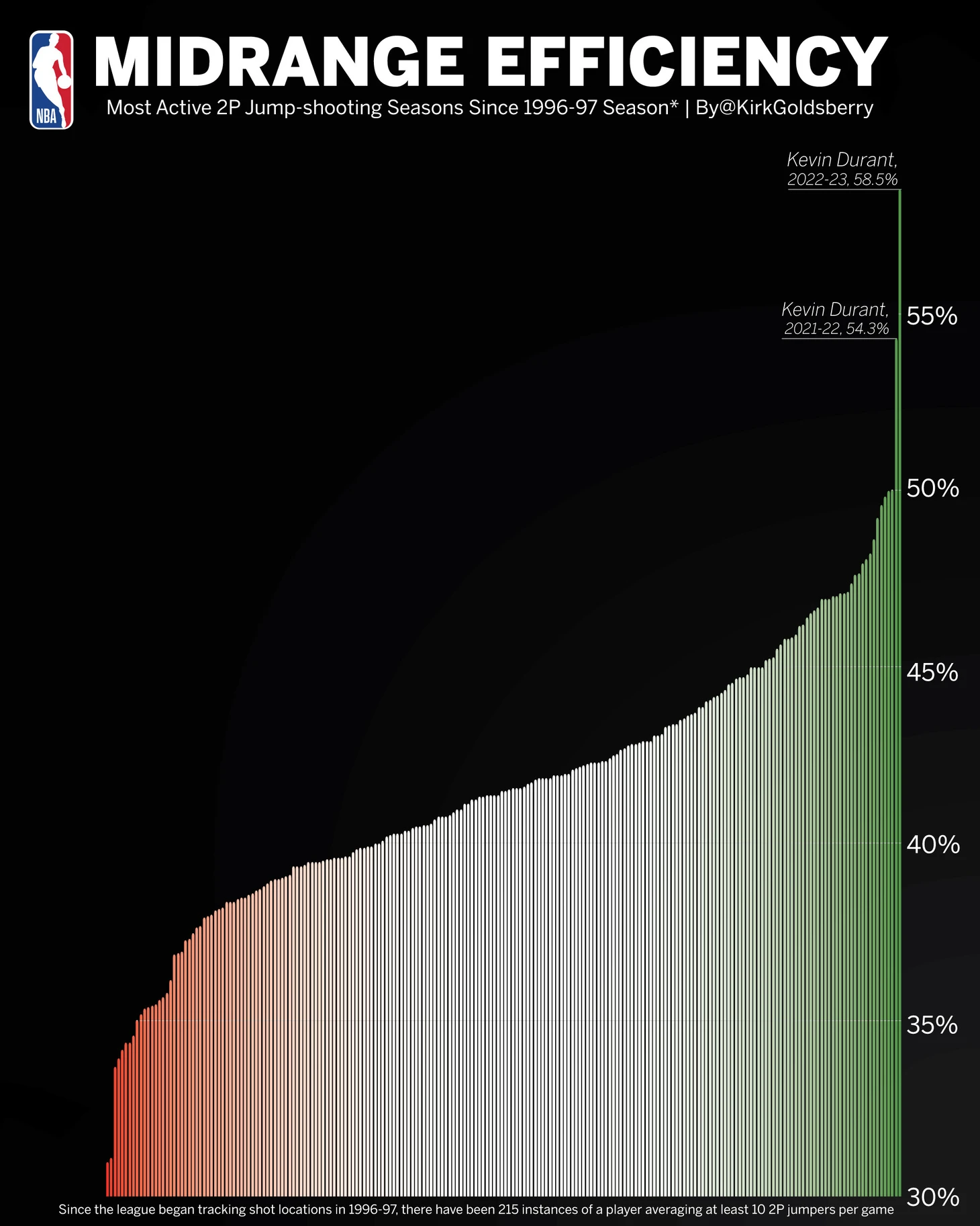 Кевин Дюрэнт реализует 58,5 процента бросков со средней дистанции. Это лучший результат с 1996 года