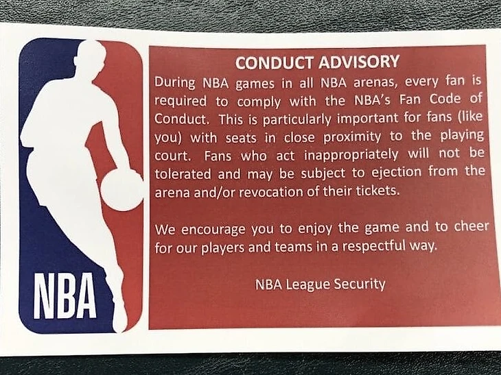 «Во время матчей на всех аренах лиги каждый посетитель обязан соблюдать кодекс поведения болельщиков НБА. Это особенно важно для поклонников (таких как вы), которые располагаются в непосредственной близости от игровой площадки. Неподобающее поведение является неприемлемым и может привести к удалению с арены и/или аннулированию абонементов.