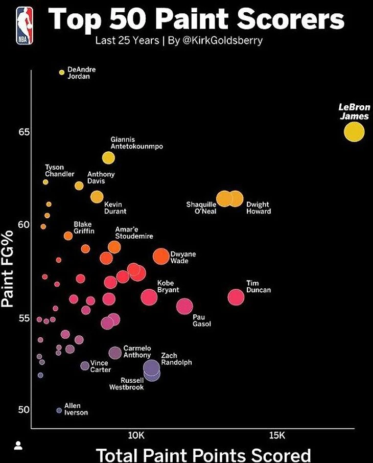Форвард «Лейкерс» Леброн Джеймс с большим отрывом лидирует в НБА по количеству очков, набранных из трехсекундной зоны за последние 25 лет. Он единственный, кто записал на свой счет более таких 15 000 очков.