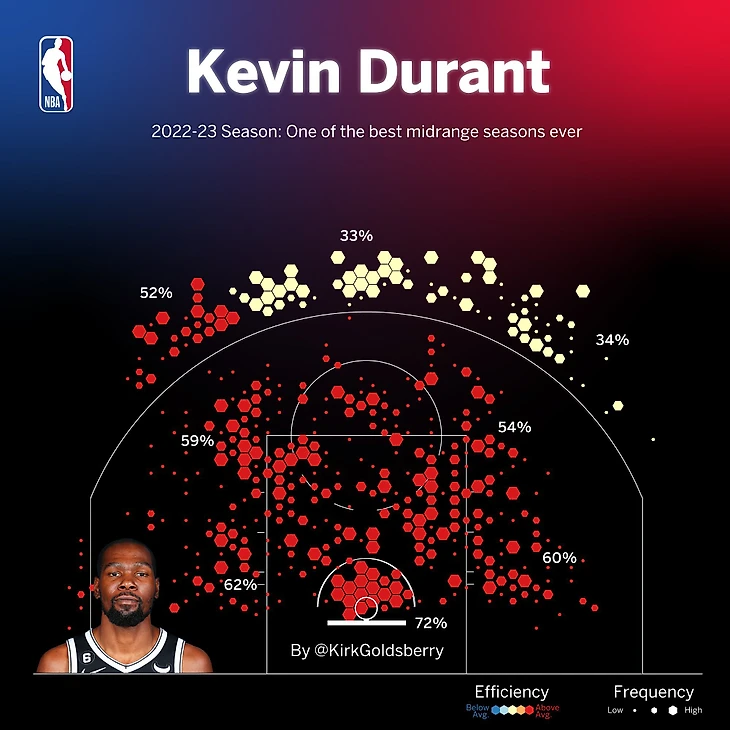 Аналитик ESPN Кирк Голдсберри опубликовал инфографику бросков звездного форварда «Бруклина» Кевина Дюрэнта в сезоне-2022/23.