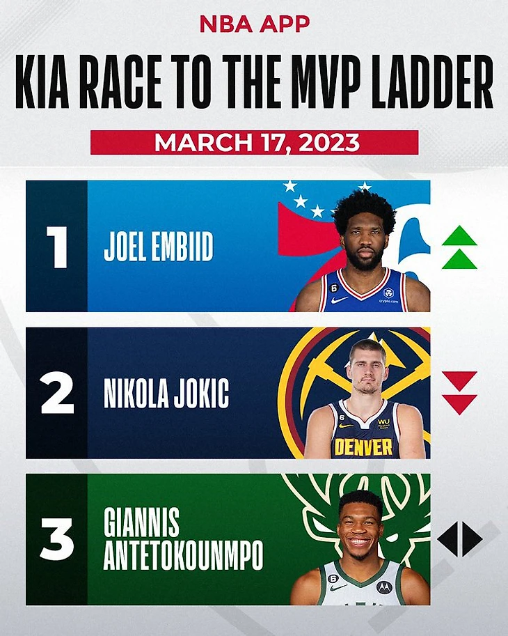 Центровой «Филадельфии» Джоэл Эмбиид обошел лидера «Денвера» Николу Йокича и поднялся на первую строчку в списке самых ценных игроков сезона за три недели до конца регулярного чемпионата.
