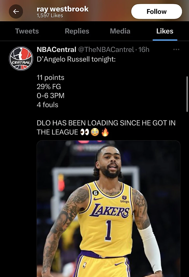 Младший брат разыгрывающего «Клипперс» Расселла Уэстбрука, Рэйнард Уэстбрук, лайкнул твит о неудачной игре Д’Анджело Расселла («Лейкерс») в матче против «Далласа» (110:111).