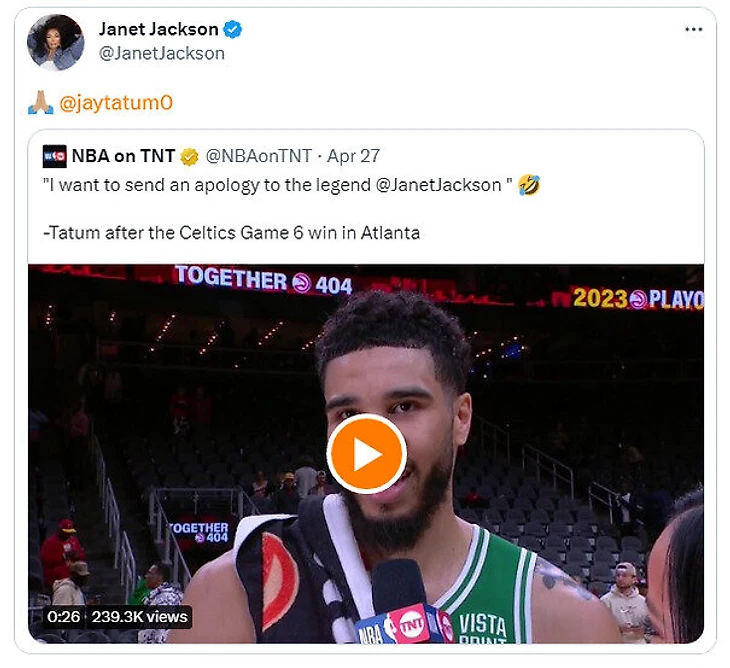 «Хочу извиниться перед легендарной Джанет Джексон за перенос ее концерта. Мы должны были завершать серию в Бостоне. Ей пришлось перенести шоу. Надеюсь, она это услышит. Я приношу извинения», – сказал Тейтум.