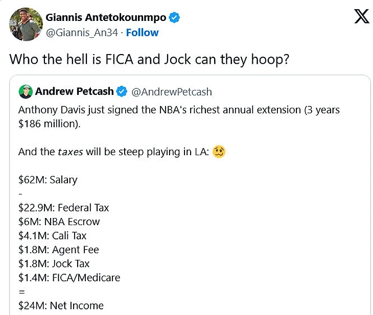 «Кто, черт возьми, такие FICA и Jock?» Яннис Адетокумбо пошутил о налогах на зарплату Энтони Дэвиса