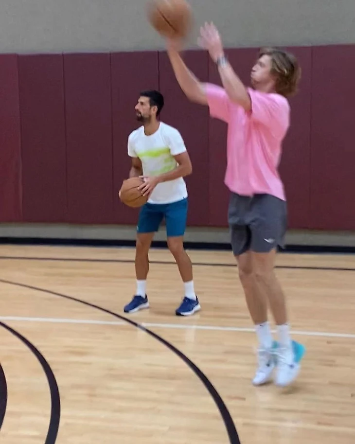Вторая ракетка мира и рекордсмен по количеству побед на турнирах Большого шлема Новак Джокович вышел на баскетбольную площадку с известным российским теннисистом Андреем Рублевым.
