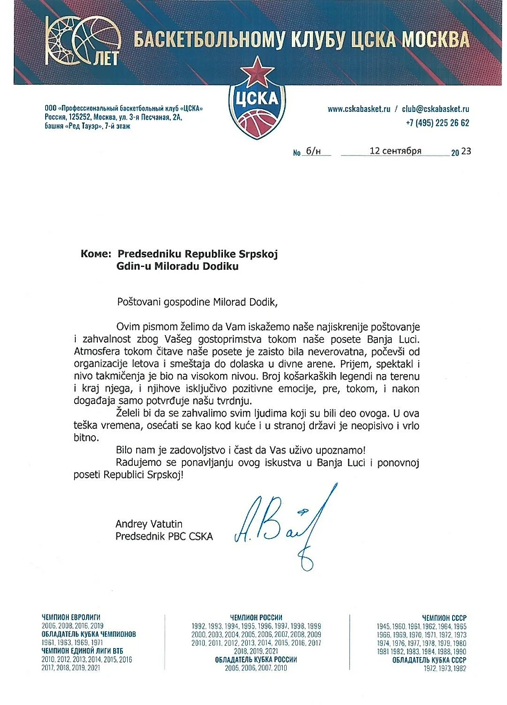 Для нас было удовольствием и честью встретиться с вами лично! Московский ЦСКА с нетерпением ждет возможности снова посетить Баня-Луку и Республику Сербскую!» – говорится в письме Андрея Ватутина.