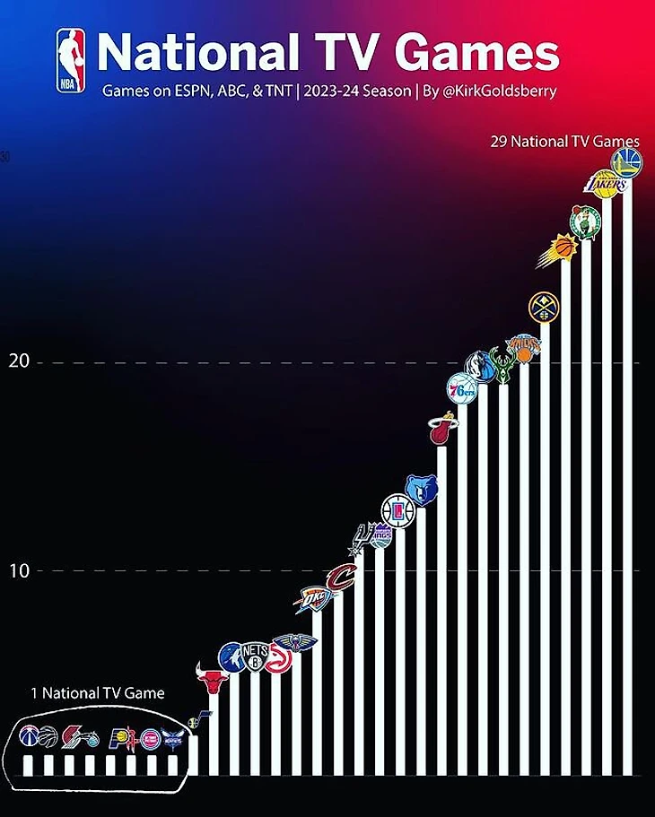 «Голден Стэйт» получил наибольшее количество трансляций на национальном телевидении (ESPN, ABC, TNT) в сезоне-2023/24 – 29 матчей.