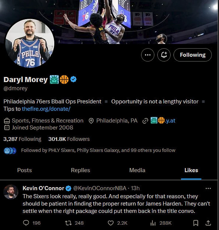 Дэрил Мори лайкнул твит, что «Сиксерс» надо ждать лучшее предложение по Джеймсу Хардену