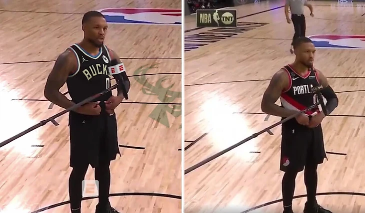ESPN нарисовал на площадке логотип «Бакс», заменили майку «Блэйзерс» Лилларда на майку «Бакс» и даже заменил логотип TNT на логотип ESPN на микрофоне.
