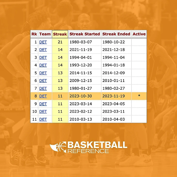 Это третья 11-матчевая серия поражений для «Пистонс» за календарный год.