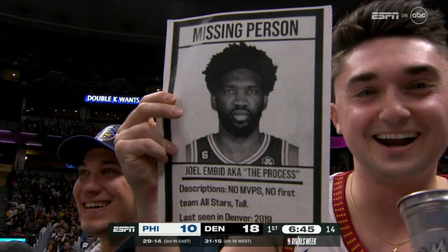 Болельщики на старте матча начали скандировать «Где Эмбиид?», а некоторые принесли прошлогоднюю листовку с надписью «Пропавший без вести», фотографией и неправильно написанной фамилией Эмбиида: «0 MVP, 0 стартовых пятерок на Матче звезд, высокий. Последний раз видели в Денвере в 2019».