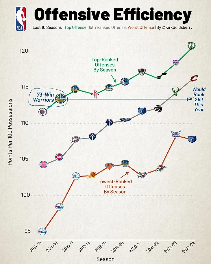 Эксперт сравнил нападение «Голден Стэйт», который выиграл 73 матча в регулярном сезоне, и атаки клубов лиги в этом сезоне. Атака «Уорриорс» в сезоне-2015/16 была лучшей в лиге, но по эффективности оказалась бы на 21-м месте сейчас, уступив атаке «Торонто», идущих с показателями 19-36.