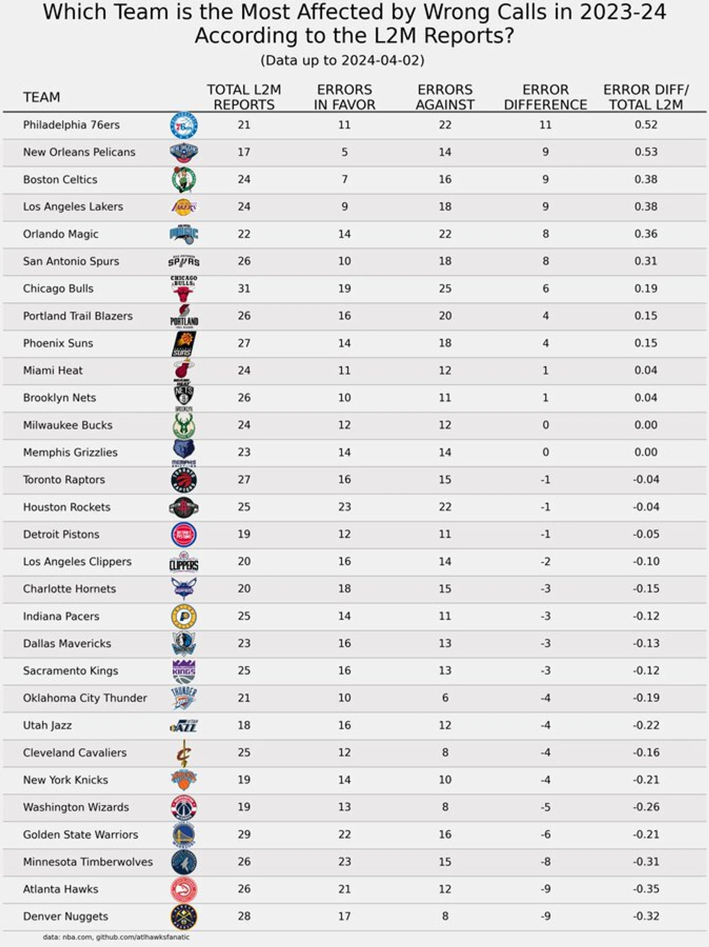 По результатам отчетов за последние 2 минуты матчей, «Филадельфия» чаще всего становилась объектом неверных решений арбитров – 22 раза. В пользу «Сиксерс» судьи ошибались 11 раз.