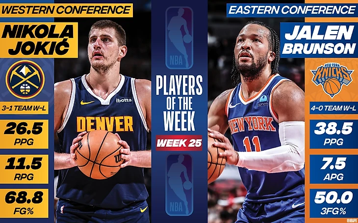 Центровой «Денвера» Никола Йокич и защитник «Нью-Йорка» Джейлен Брансон – лучшие игроки 25-й недели в НБА