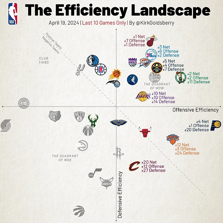 • Баскетбольный аналитик Кирк Голдсберри представил график эффективности команд за последние 10 игр