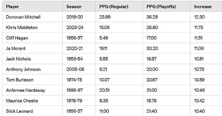 Это второй по величине скачок результативности между регуляркой и плей-офф в истории НБА. Рекорд принадлежит защитнику «Кливленда» Доновану Митчеллу – 12,3 очка.