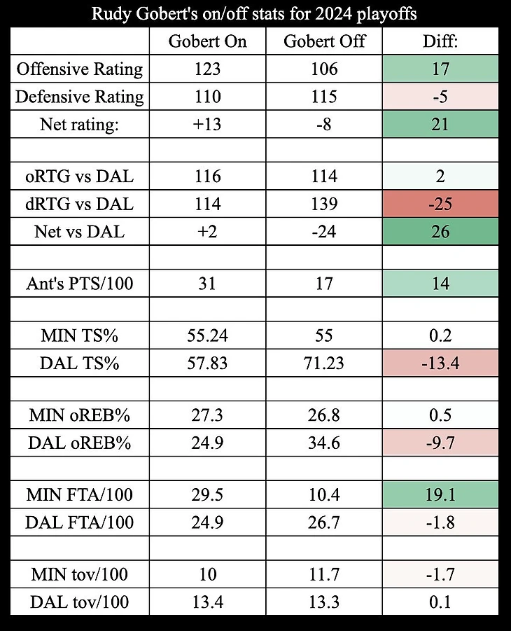 Показатели «Тимбервулвс» в финале Западной конференции против «Далласа» (0-3) лучше во всех категориях, когда центровой Руди Гобер находится на площадке.