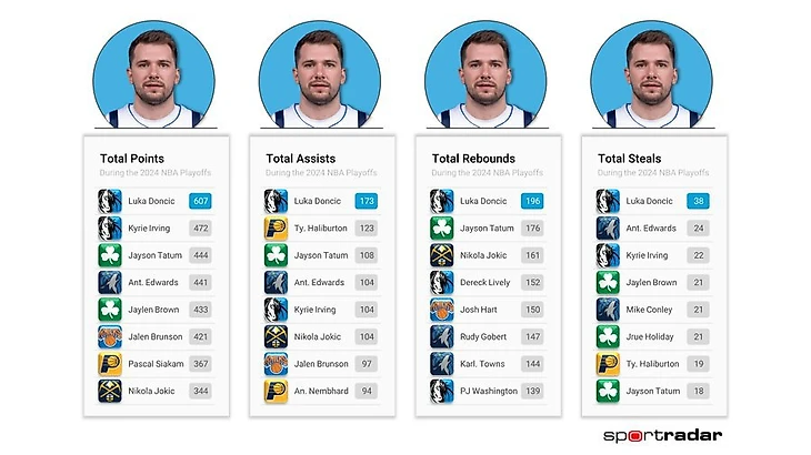 Лука Дончич лидирует в плей-офф-2024 по основным показателям.