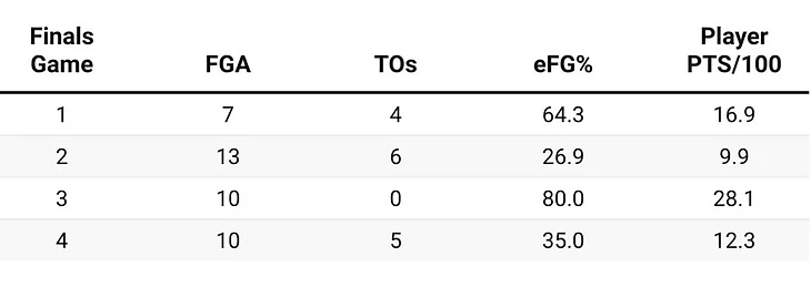 Показатель реализации бросков его противников (eFG%), с учетом стоимости трехочковых бросков, составил 35%. В третьем матче серии этот же показатель оппонентов составлял 80%.