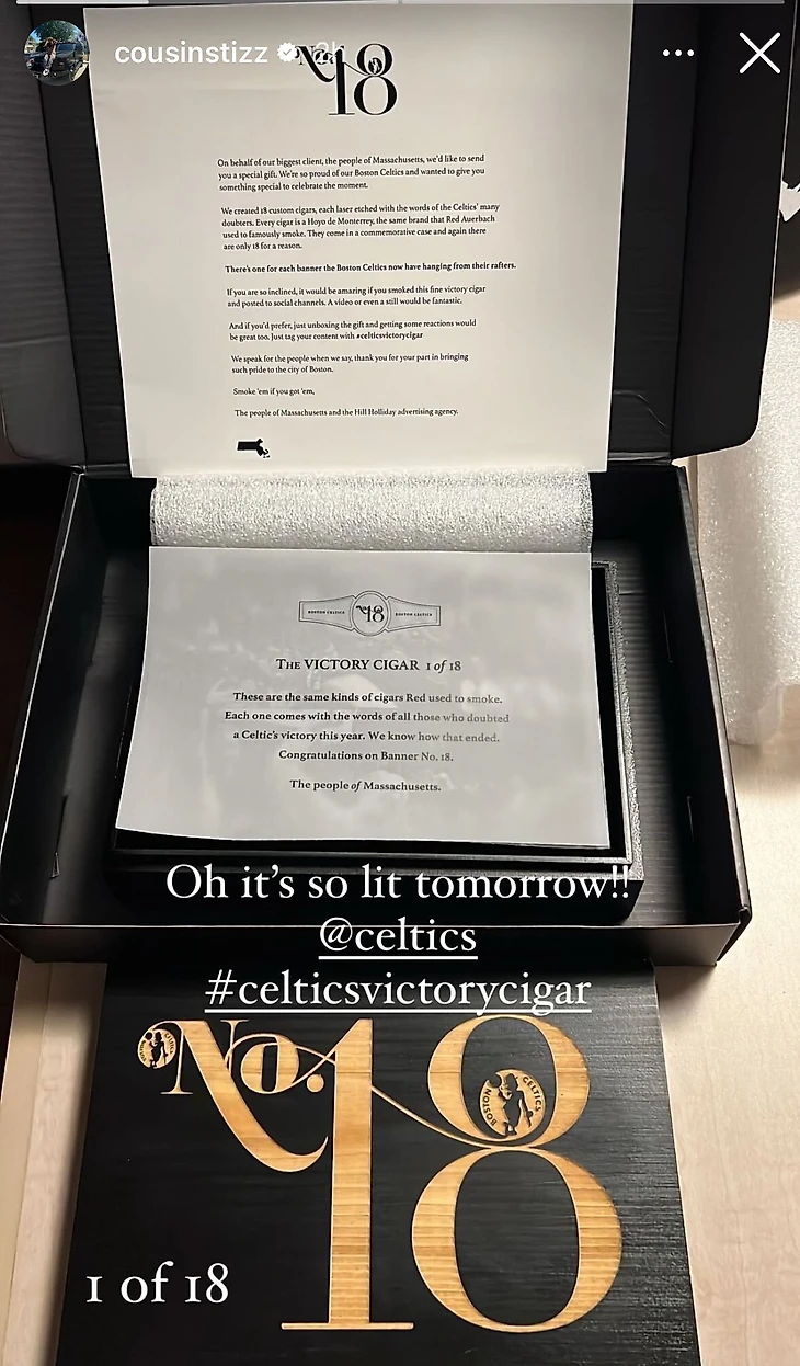 «Это те же сигары, что любил курить Ред Ауэрбах. Каждая идет со словами тех, кто сомневался в нашей победе. Мы знаем, как все завершилось. Поздравляем с 18-м баннером».