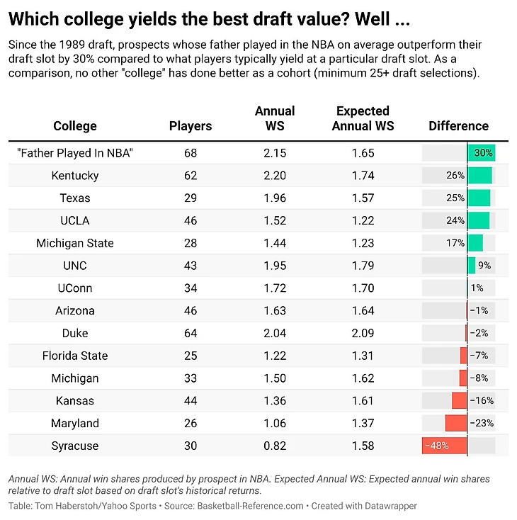Аналитик сравнил годовые показатели win shares (комплексный показатель, оценивающий вклад игрока в победы команды) с ожидаемыми и получил интересный результат. Сыновья игроков, выступавших в НБА, в среднем превосходят первоначальные ожидания от их карьеры на 30%. Статистически этот показатель стал самым существенным по сравнению с игрой за значимые баскетбольные программы университетов в NCAA.