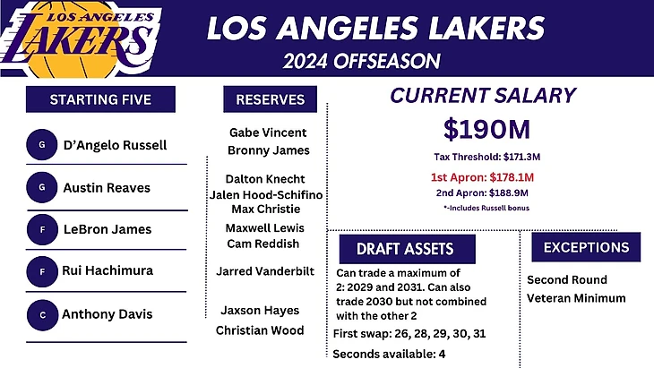 «Лейкерс» и Джеймс согласовали 2-летний максимальный контракт на 104 миллиона долларов. После подписания контракта со звездным форвардом суммарная зарплата игроков команды составит 190 миллионов. Это чуть выше второго порога налога на роскошь, который составляет 188,9 млн.