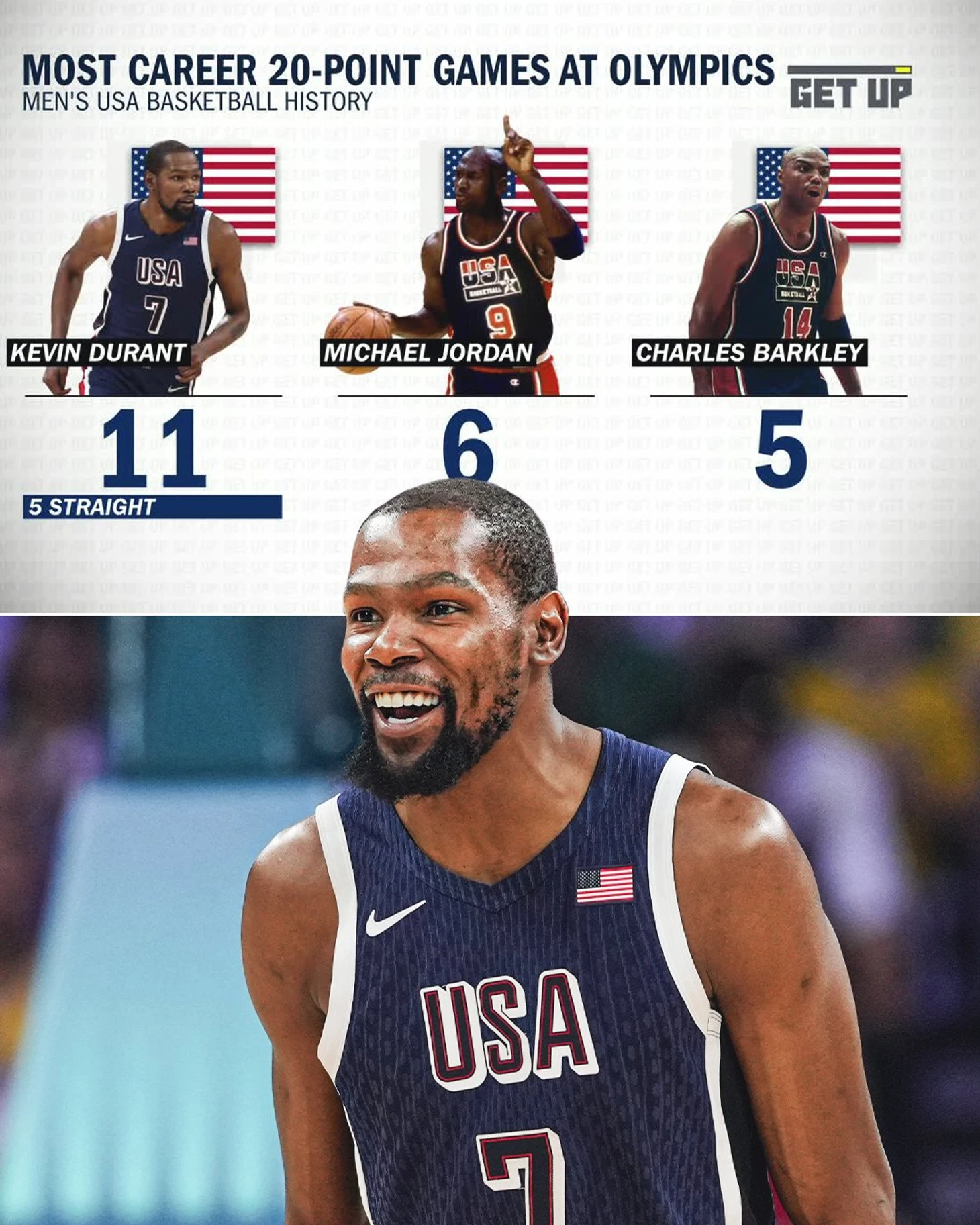 Кевин Дюрэнт лидирует в истории сборной США по количеству матчей с 20 и более очками на олимпийских турнирах (11)