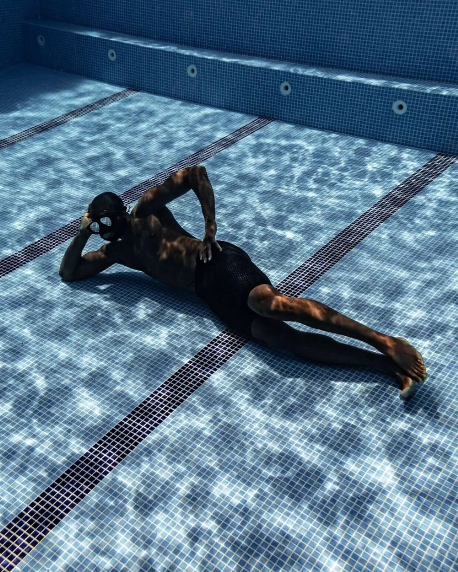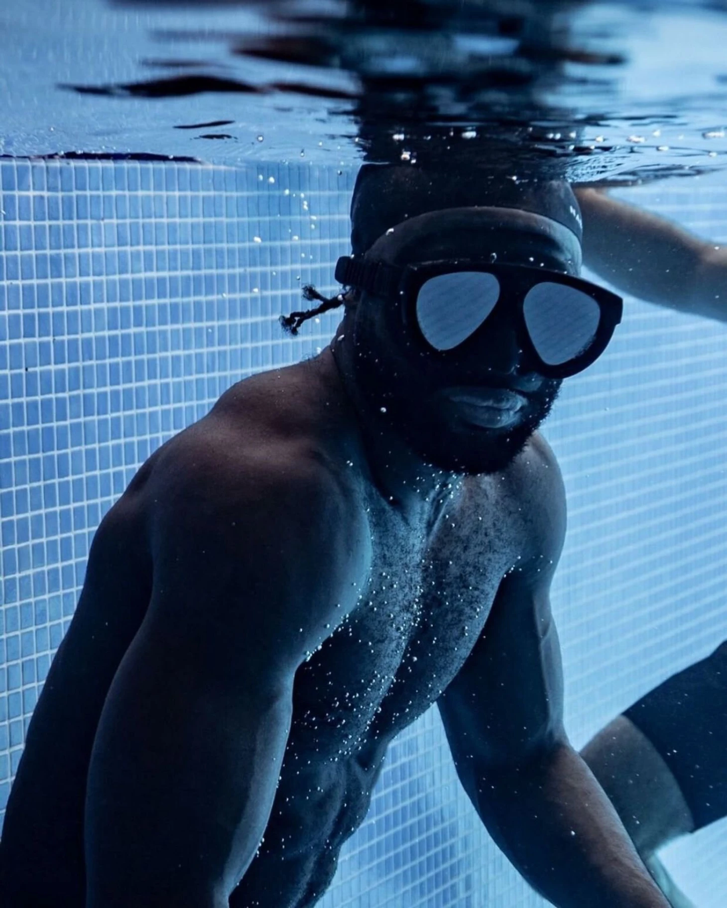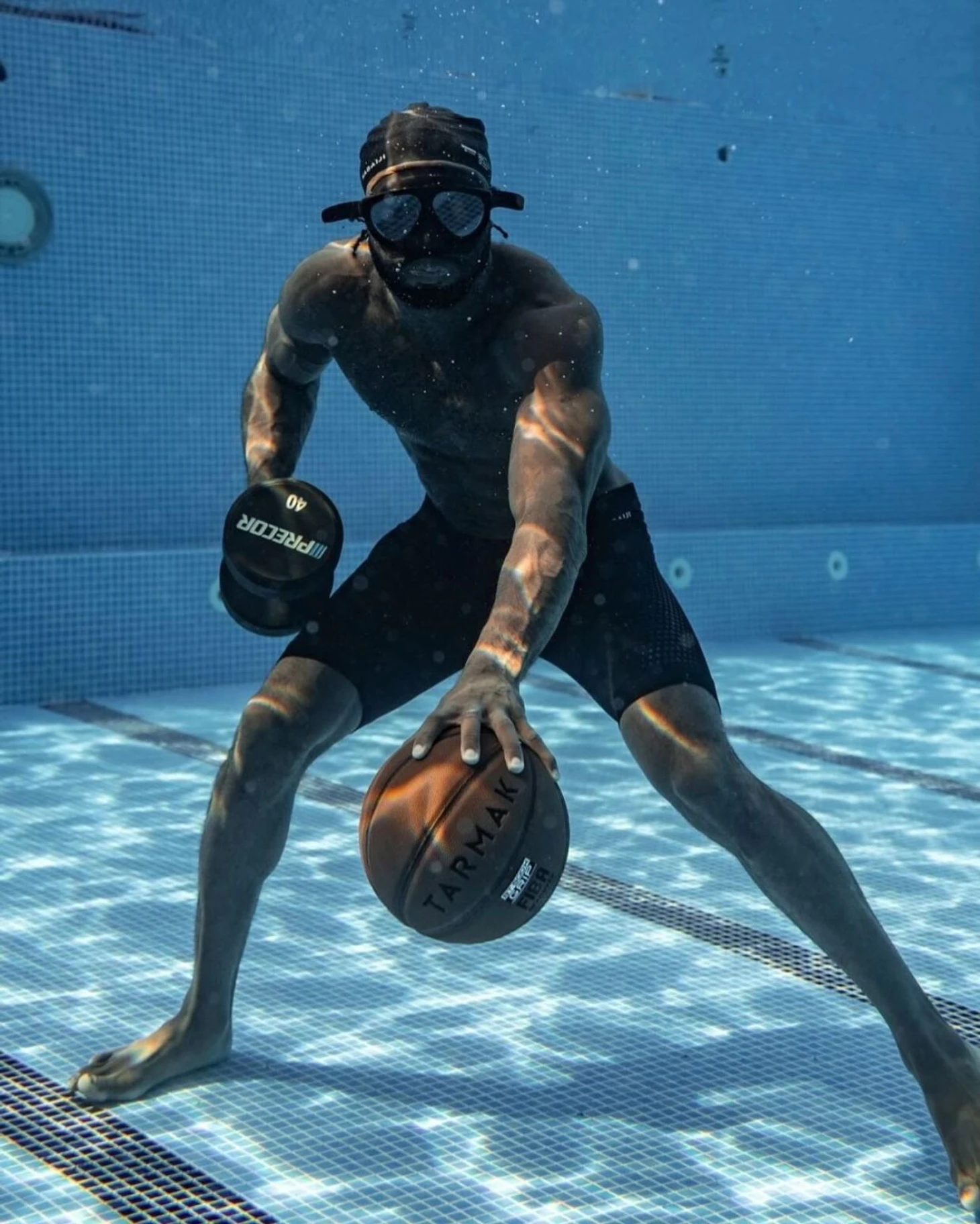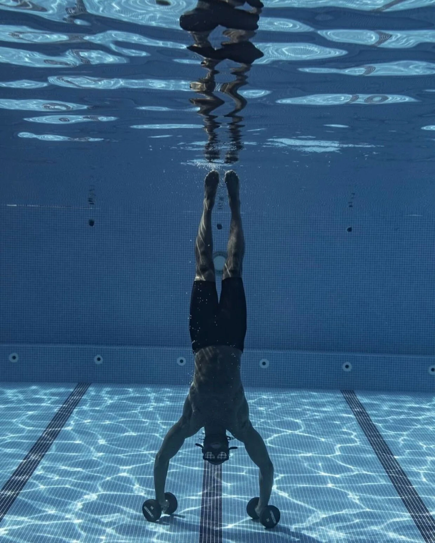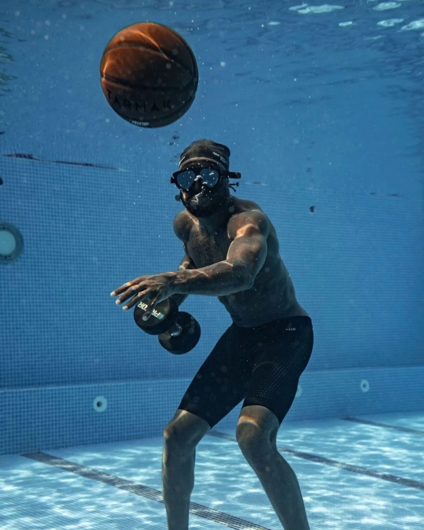 Баскетболист готовится к новому сезону, выполняя упражнения на дней бассейна с гантелями.