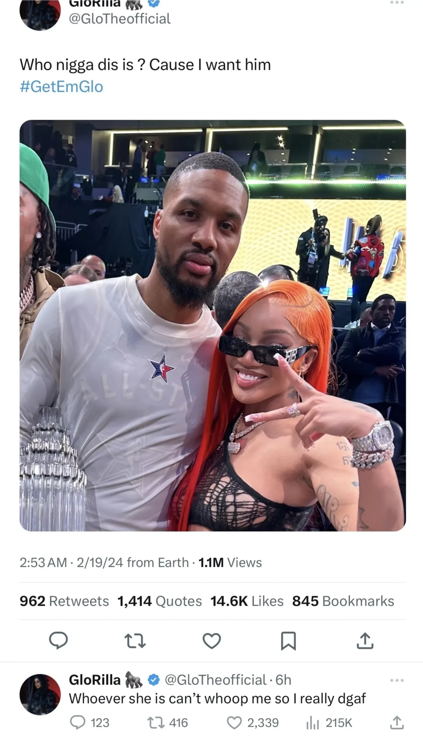 В феврале GloRilla выложила фотографию с Лиллардом с подписью: «Кто этот ниггер? Я хочу его».