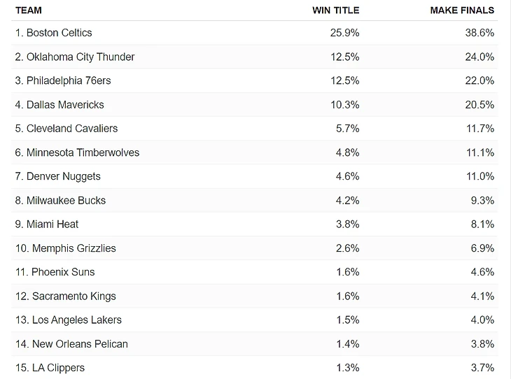 Согласно расчетам BPI, «Бостон», «Оклахома» и «Филадельфия» имеют наибольшие шансы на чемпионский титул.