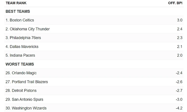BPI учитывает эффективность, сложность расписания, количество дней для отдыха, место проведения матчей и предсезонные ожидания.