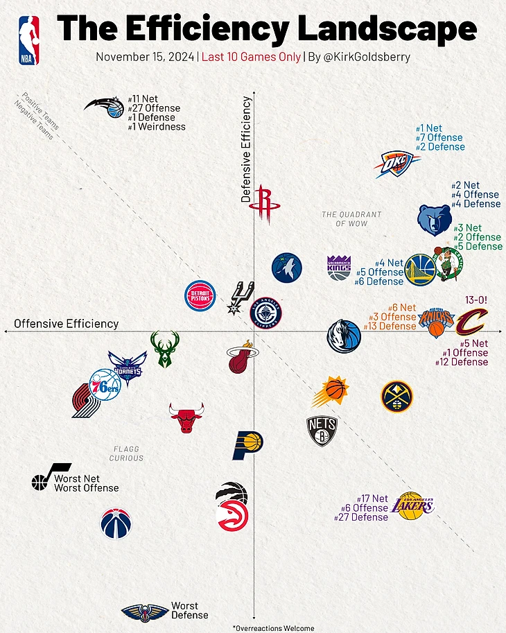 «Лейкерс» хороши в нападении. «Мэджик» – в защите». Аналитик Кирк Голдсберри выложил график эффективности команд НБА