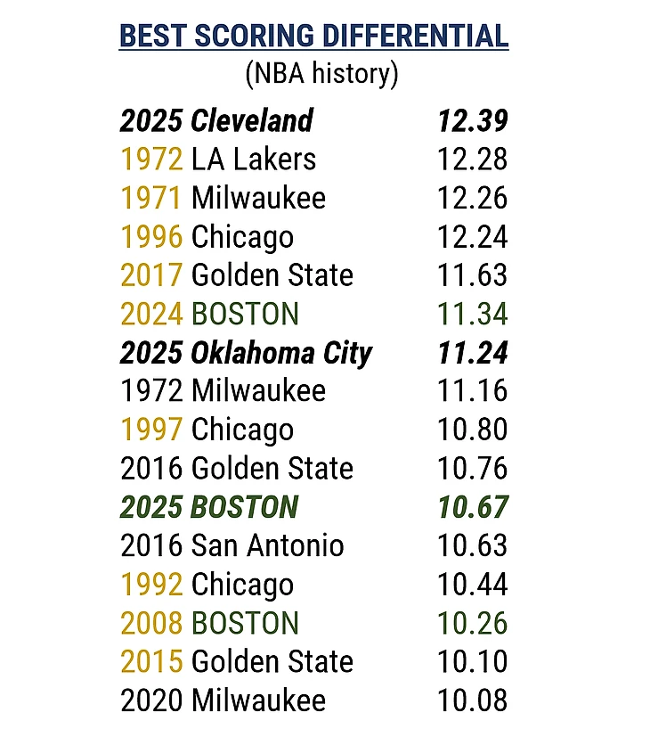 В сезоне-24/25 сыграно более 20% матчей, на данный момент сразу три команды имеют двузначную разницу – «Кливленд» (12,39), «Оклахома» (11,24) и «Бостон» (10,67).