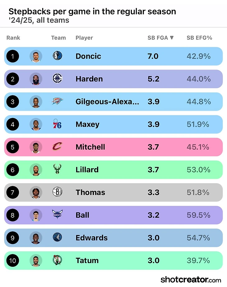 Лука Дончич лидирует по количеству бросков со степбэком, Харден – второй