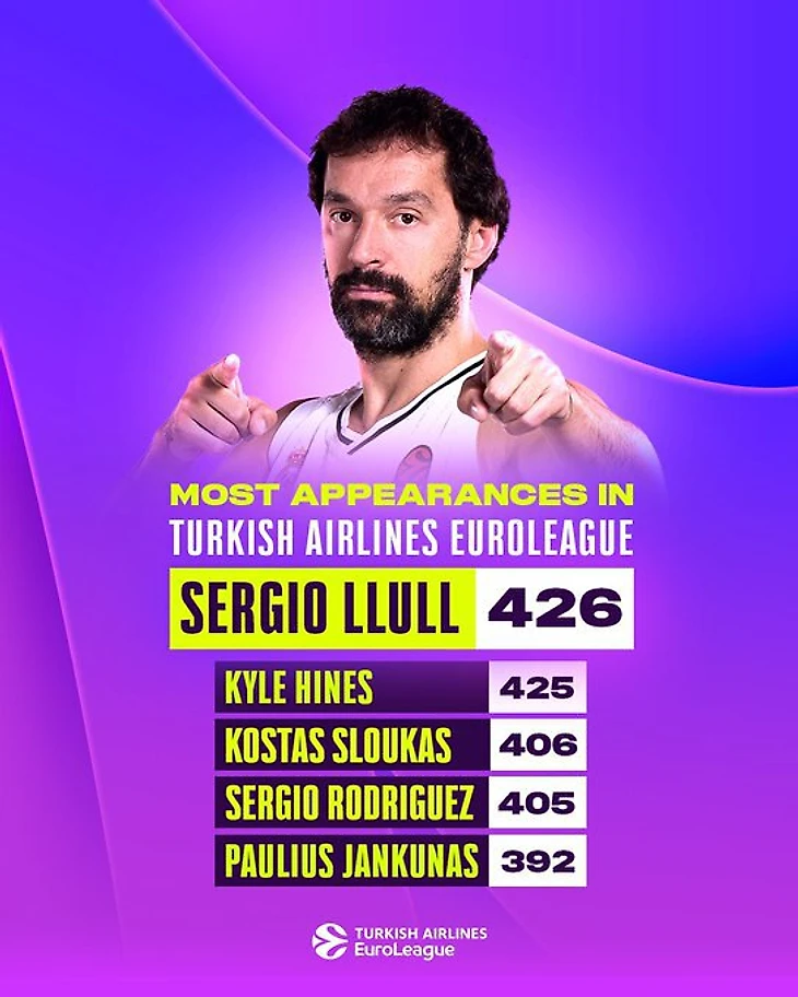 Высокие шансы опередить испанца остаются у 34-летнего разыгрывающего «Панатинаикоса» Костаса Слукаса, который идет на 3-м месте с показателем в 406 матчей.