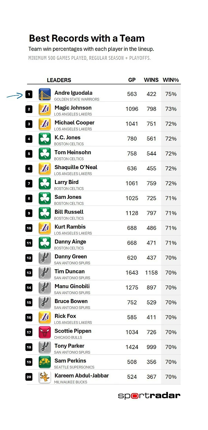 Лидером по этому показателю является четырехкраный чемпион НБА Андре Игудала, который провел 563 матча в составе «Голден Стэйт» и одержал 422 победы. Это 75 процентов.