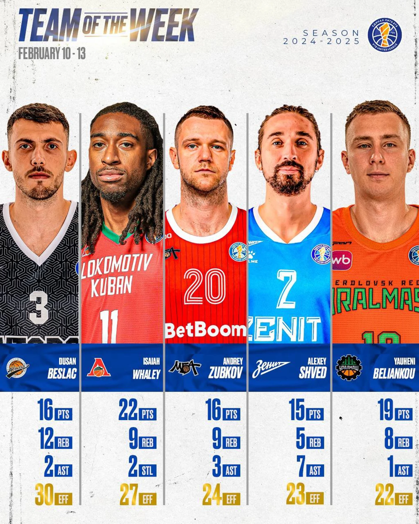 В пятерку лучших игроков по итогам матчей 10-13 февраля вошли Андрей Зубков (МБА-МАИ), Алексей Швед («Зенит»), Евгений Белянков («Уралмаш»), Душан Беслач («Автодор») и Айзейя Уэйли («Локомотив-Кубань»).