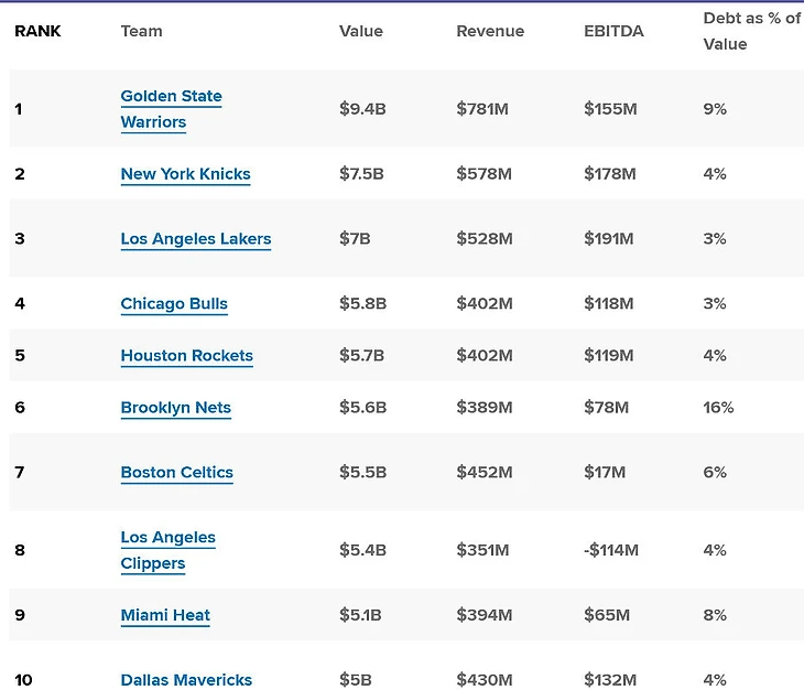 Самый дорогой клуб НБА — «Голден Стэйт», его стоимость составляет 9,4 млрд долларов. В сезоне 2023/24 «Уорриорз» получили 781 млн дохода — за вычетом выплаты по разделению доходов — что является самым высоким показателем в НБА. «Уорриорз» владеют домашней ареной, «Чейз-центр» в Сан-Франциско, с которой они также получают доход от мероприятий, не связанных с НБА. По словам руководителя лиги, в прошлом сезоне команда заработала почти 200 млн долларов спонсорских доходов, что почти вдвое больше, чем у любой другой команды.