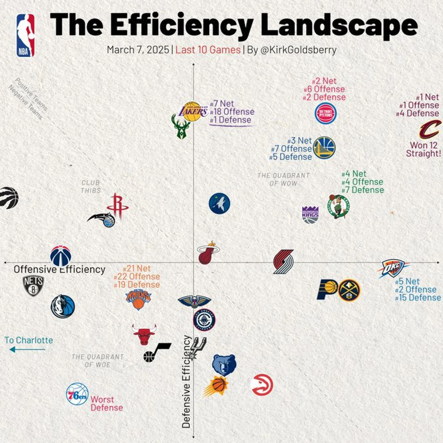 Аналитик Кирк Голдсберри выложил график эффективности клубов НБА.
