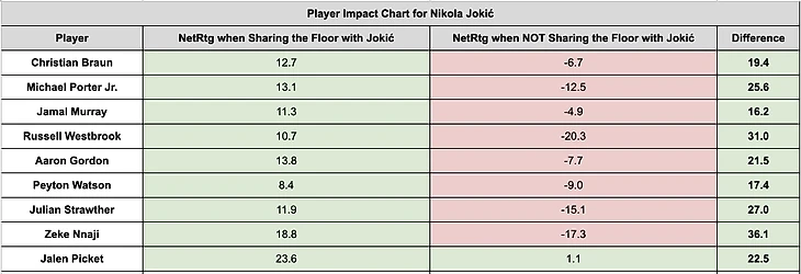 Журналист Bleacher Report Энди Бэйли опубликовал таблицу с показателями «Net rating» игроков «Денвера» с Николой Йокичем на площадке и без него.
