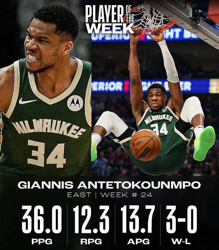 В активе Адетокумбо 36 очков, 12,3 подбора и 13,7 передачи в среднем. «Бакс» завершили неделю с результатом 3-0.