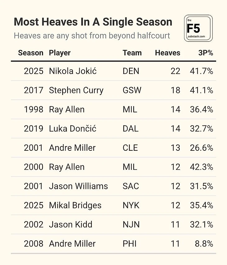 Центровой «Денвера» завершил регулярный чемпионат сезона-2024/25 с 22 бросками со своей половины площадки, что является новым рекордом НБА с тех пор, как лига начала фиксировать точки, откуда был совершен бросок (1996/97).
