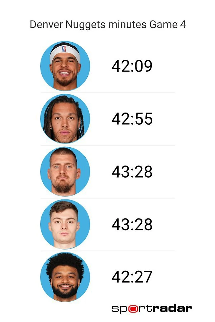 Все игроки стартовой пятерки «Денвера» сыграли не менее 42 минут в 4-м матче. Это первый случай в матче плей-офф с 1997 года