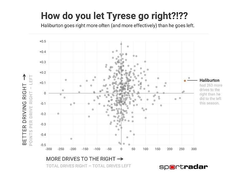 Эксперт Тодд Уайтхед опубликовал график, который показывает, что разыгрывающий «Индианы» гораздо чаще и более эффективно обыгрывает соперников при помощи проходов в правую сторону.