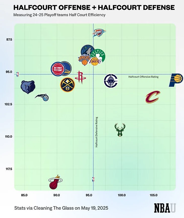 «Индиана» оказалась лучше в нападении, а «Оклахома» – в защите. Рассматривались владения 5 на 5 на стадии плей-офф, без учета быстрых розыгрышей и ранних атак, перехода из защиты в нападение.