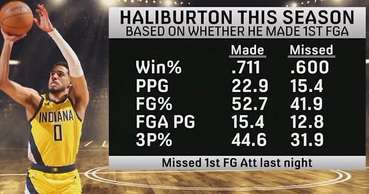 Показатели Халибертона в матчах, в которых он смазал первый бросок: 15,4 очка, 41,9% с игры, 31,9% из-за дуги, 12,8 броска с игры. «Пэйсерс» выиграли 60,0% матчей.