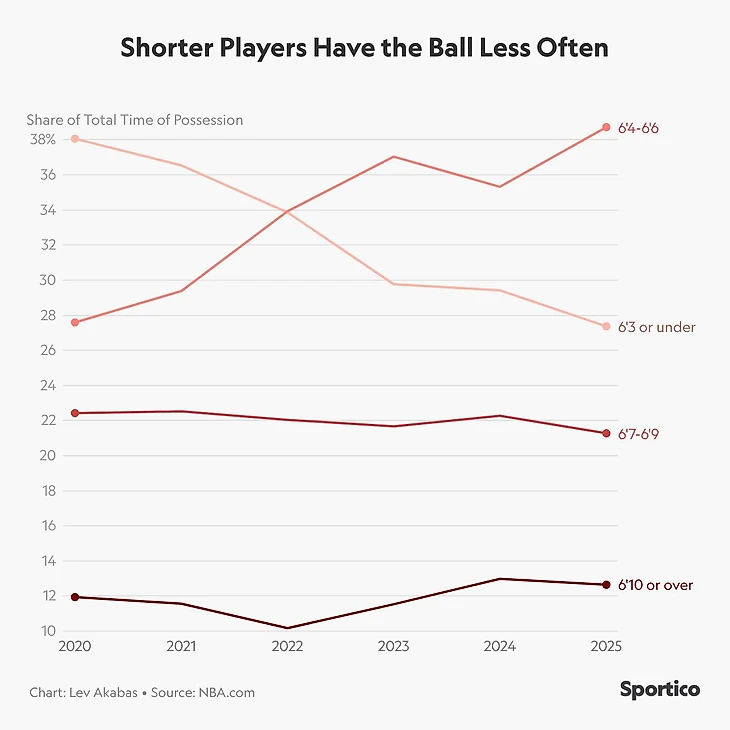 Пять лет назад в 38% случаев владения мяч находился в руках баскетболистов ростом 190 см или ниже. В сезоне-2024/25 этот показатель составил всего 27%.
