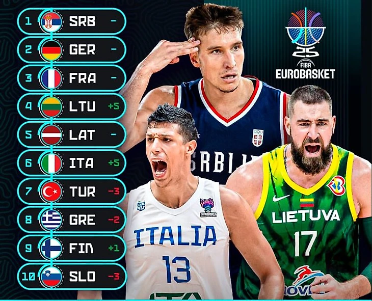 Сербия, Германия и Франция продолжают возглавлять список. Литва и Италия поднялись на 5 позиций по итогам последних товарищеских матчей и занимают 4-е и 6-е места соответственно.