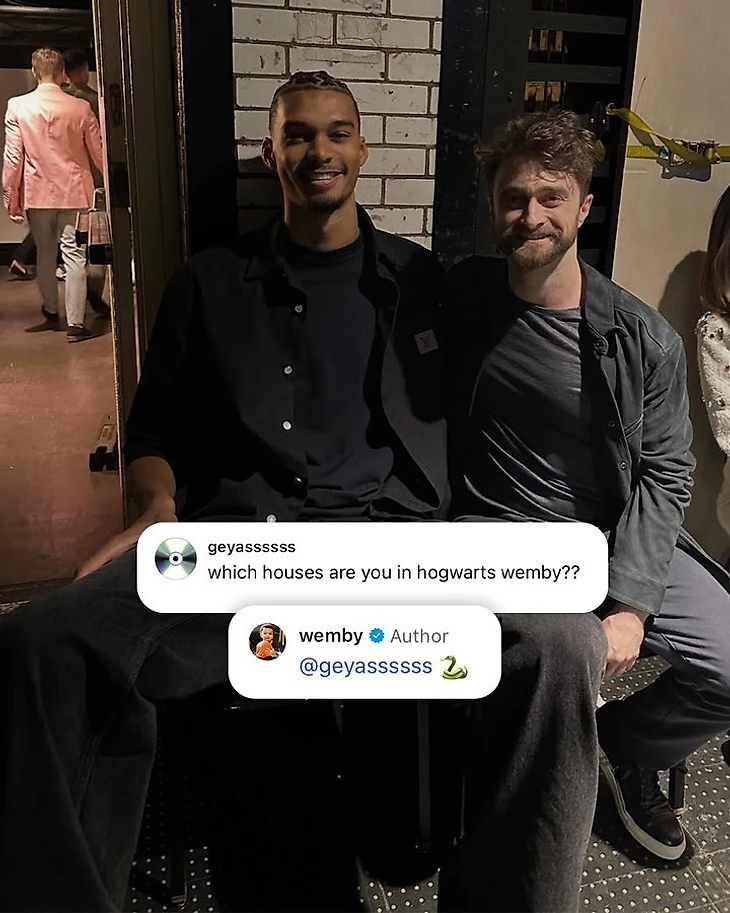 Виктор Вембаньяма в соцсетях опубликовал фото с Дэниелом Рэдклиффом. В комментариях один из фанатов спросил у баскетболиста: «На какой факультет Хогвартса тебя бы распределили?»
